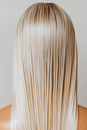 Smooth straight blonde hair in a sleek style, showcasing healthy shine and elegance, perfect for hairstyling concepts and hair care promotions