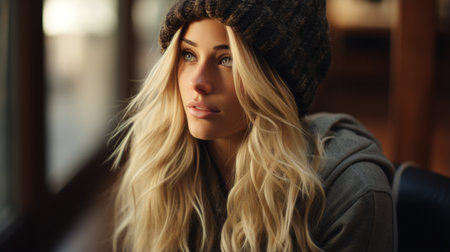a woman with long blonde hair wearing a beanie