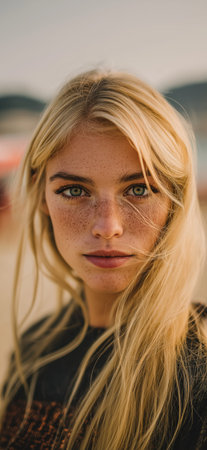 Young blonde woman with freckles posing on a sunny beach, offering a direct gaze. Blonde woman with freckles looking at camera on beach