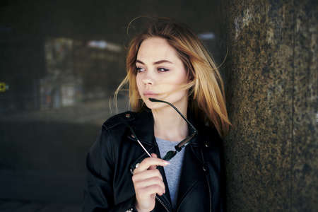 Stylish girl. A beautiful young blonde in fashionable clothes on a city street with a building in the background. A girl with long blond hair.