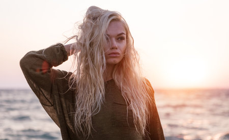 Beautiful 25 year old blonde woman at the beach, around sunset