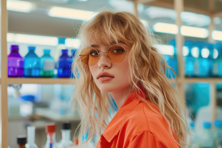 A young woman with blonde hair and orange sunglasses stands in a laboratory with a bookshelf full of blue bottles behind her.