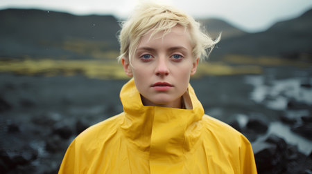An AI illustration of A young female with fair hair, wearing a black jacket, and blue eyes, stands in a casual pose