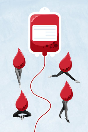 3D photo collage trend composite sketch image of huge donor donation blood drops posing hearts volunteers help leukemia ill people