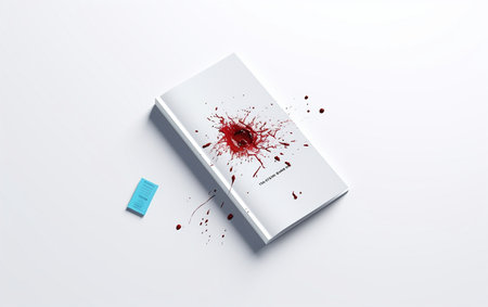 Vivid red blood droplets form a striking pattern against a clean white background, evoking emotion and artistry.