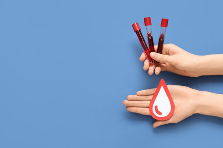Female hands with test tubes of blood and drop on blue background. Blood donation concept