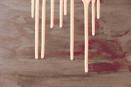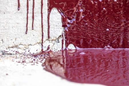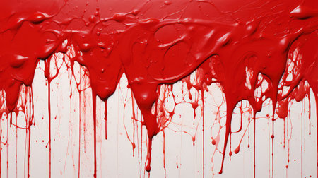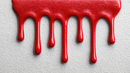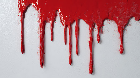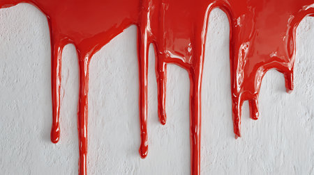Red paint or a similar substance is dripping down a textured light wall, creating an abstract and messy stain symbolizing violence, horror, or a crime scene investigation