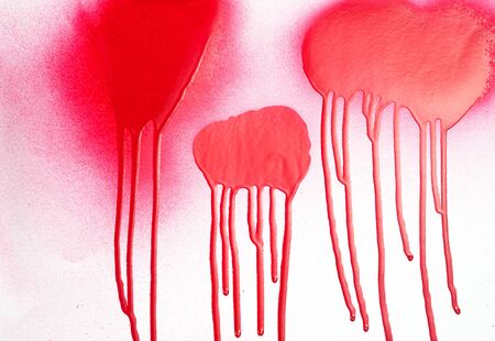 closeup of red paint drips on a white background. macro
