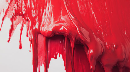 Bright red paint flows down a vertical surface, creating smooth drips and a glossy texture. The vivid color captures the essence of artistic expression and creativity.