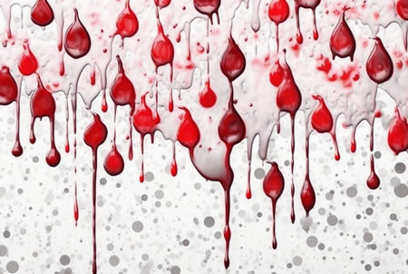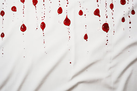 Vivid red blood droplets form a striking pattern against a clean white background, evoking emotion and artistry.