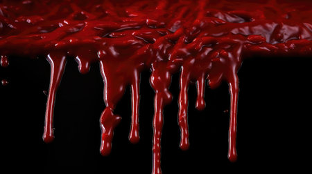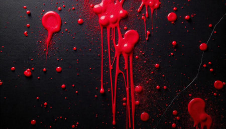 Red liquid splatters and dots on a black surface
