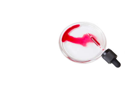 Pandemic blood test, dropper with red liquid in a petri dish.