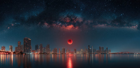 A nighttime scene showcases a city skyline reflecting in calm water, under a dark sky. The visual highlights a blood moon, casting red light across the water. Buildings are lit, with lights reflecting on the surface. This image could be suitable for diverse commercial applications.