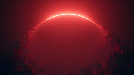 A silhouette of a person stands in a stark landscape beneath a dramatic red sky and a bright, glowing circle. The image showcases high contrast, with deep shadows and vibrant colors. The overall aesthetic is stylized, suggesting possibilities for editorial uses or conceptual illustrations.