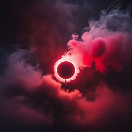 A circular red light forms a halo around a dark center, enveloped by swirling pink and red smoke against a dark background.