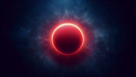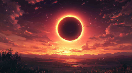A large, glowing orange sun is in the center of a dark sky. The sun is surrounded by a dark circle, which is the shadow of the sun. Concept of awe and wonder at the beauty of the sun