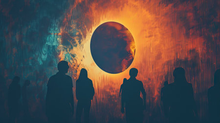 Silhouetted figures under a solar eclipse in a vibrant sky. Shadowed individuals beneath a sun and moon event. Concept of celestial phenomena, cosmic events, silhouette art, vibrant design.