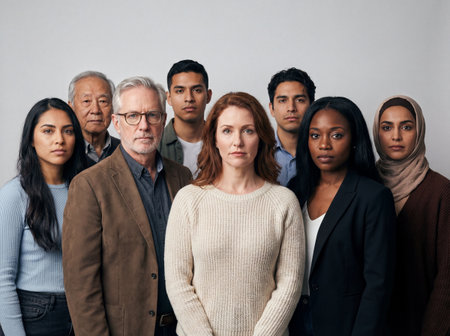 A diverse group of serious multi ethnic people including men and women of different ages stands outdoors in nature demonstrating unity and strength as a community.