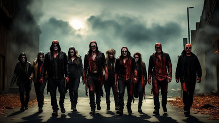 Apocalypse fantasy scene group of zombie walking. Halloween concept. AI Generated