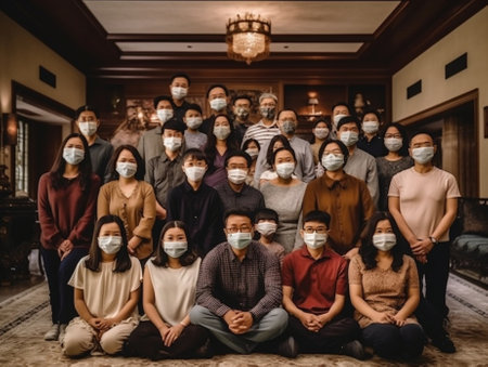 Generative AI : happy family in protective medical masks in the midst of the coronavirus pandemic at home