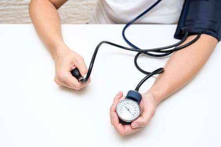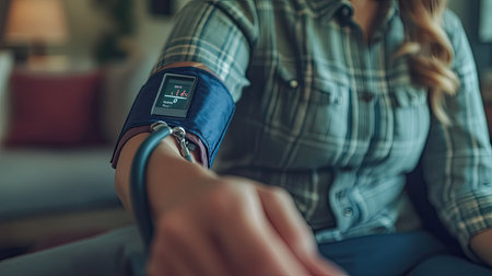 Woman measuring blood pressure by herself at home, pressure control to prevent heart cardiolvascular problems of people with high risk.
