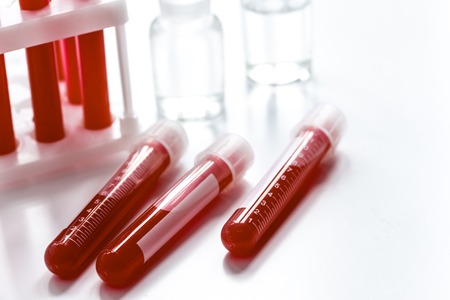 Blood samples in test tubes on a laboratory table, close up