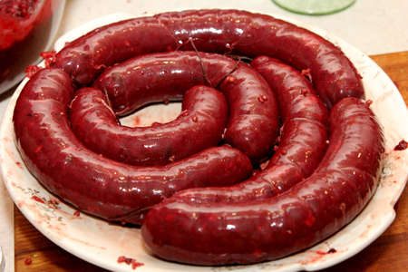 Freshly stuffed pork intestines with blood sausage mass. Organic blood sausage. Homemade sausages
