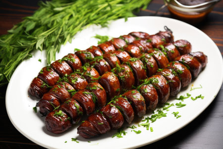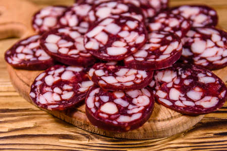 sliced pork sausage with lard while serving the table, sausage on a plate is spinning