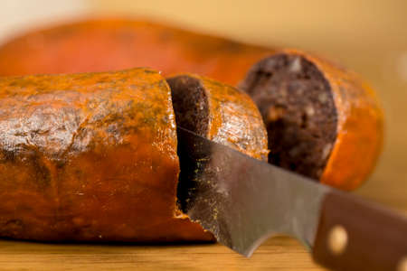 Cutting a slice of traditional homemade blood sausage