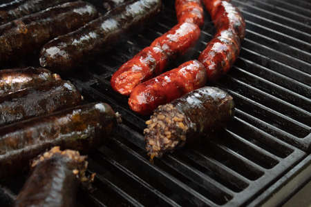 Close up on details of homemade sausages on barbecue grill. Barbecue, grill and food concept.