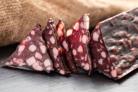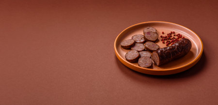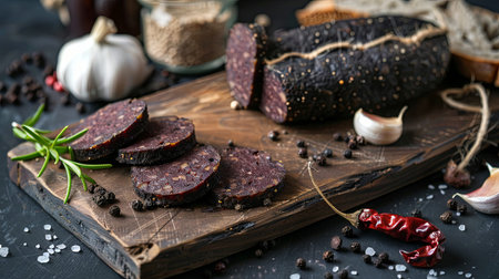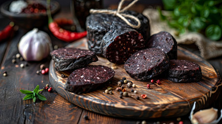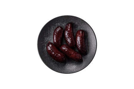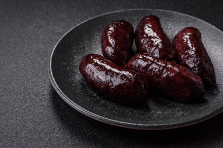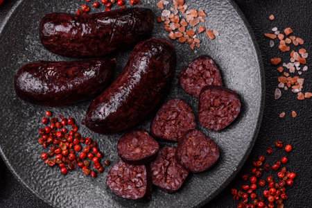 Delicious black blood sausage or black pudding with spices and herbs grilled on a black concrete background