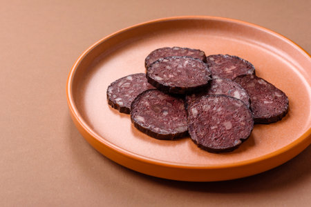 Black blood pudding, grilled pork sausage cooked for dinner. Blood pudding as a food background for your design