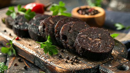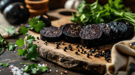 Raw Black Pudding with parsley on rustic stone board