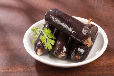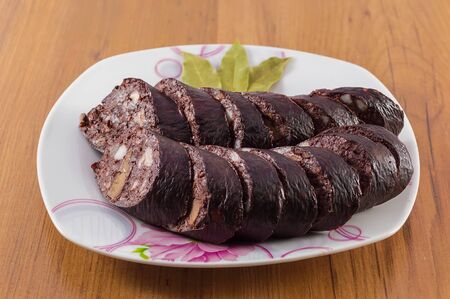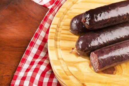 Blood sausage, pudding, meat food with lard and spices. Blood sausage cooked on the grill for dinner