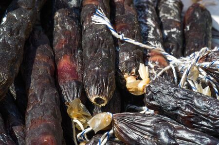 Sucuk meat sausage, Sujuk dry spicy sausage. street food traditional dish