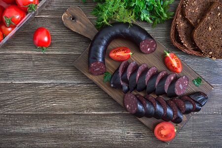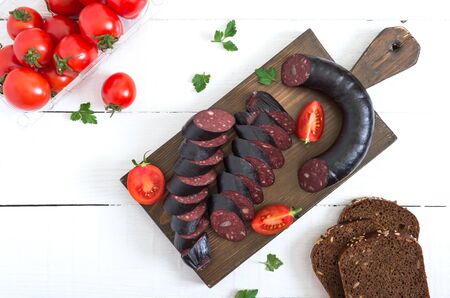 Delicious homemade blood sausage with garlic and spices. Sausage slices, cherry tomatoes and parsley on plate