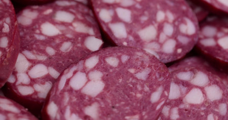 sliced ​​parts of sausage, salami close-up. fast food and breakfast