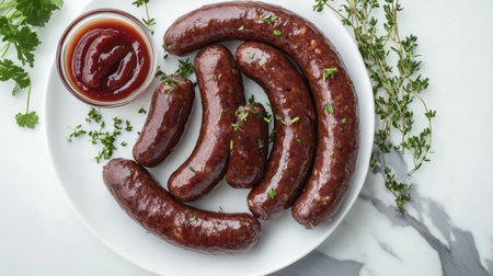 Homemade meat or vegan sausage grilled with salt spices and herbs on dark concrete background. Homemade sausage cooked on barbecue