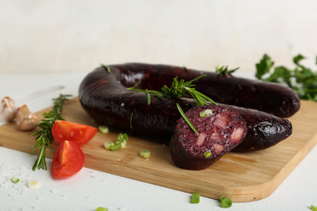Tasty blood sausage with tomato and herbs on light background