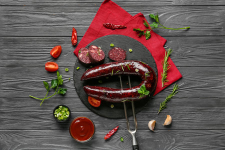 Composition with tasty blood sausage on dark wooden background