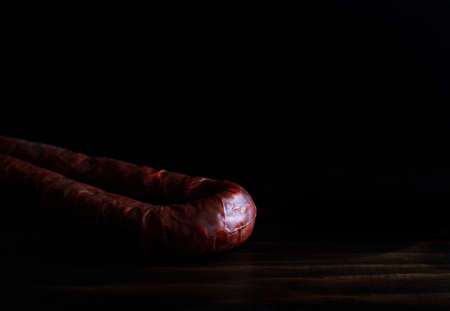 jerked sausage with fat on a dark background