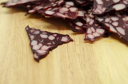 many triangular pieces of sausage with fat on a wooden background