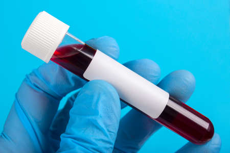 Sample of blood in vitro to the hand in glove on a blue background. empty space for text