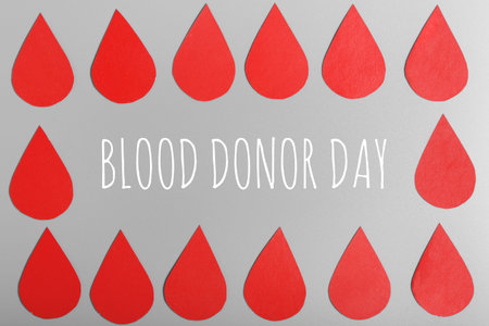 White text on gray background, frame made of drops of blood. World Blood Donor Day. Info card, postcard.
