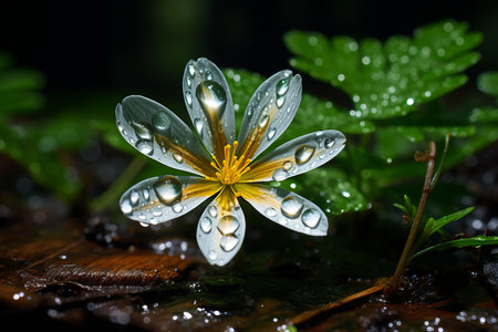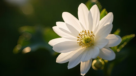 A stunning image capturing the first soft light of dawn shining through the delicate petals of a beautiful spring flower in a serene forest clearing The warm golden glow creates a mesmerizing and