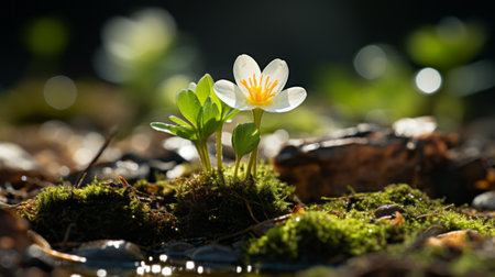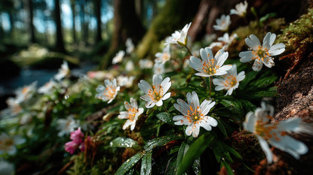 Tranquil spring forest landscape with blooming flowers and mossy rocks copy space available