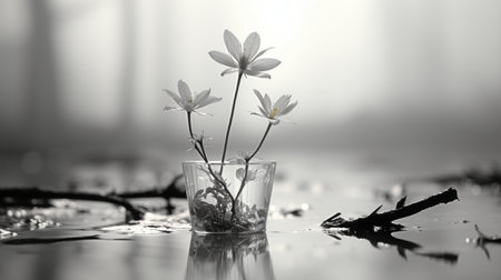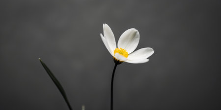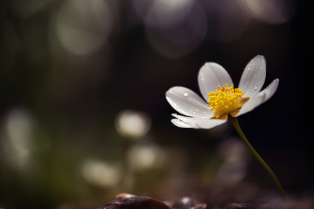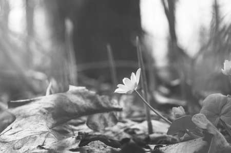 Beautiful wild spring nature. Small flower in forest. Soft focus, black and white composition, high key