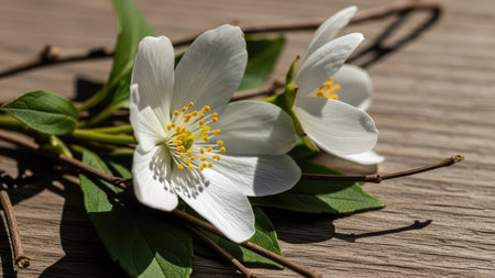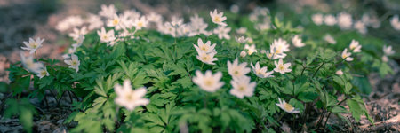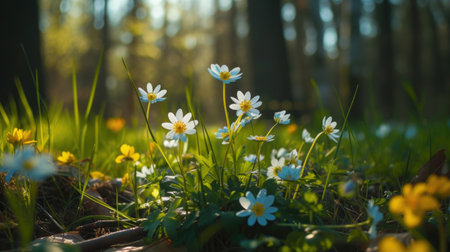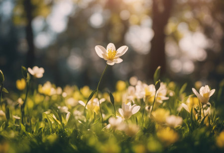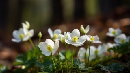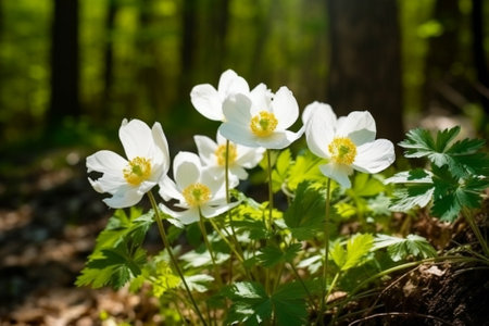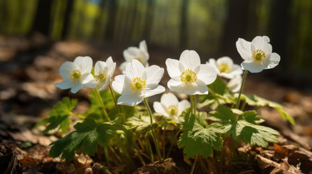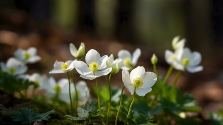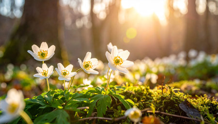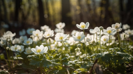 Delicate white wildflowers bask in sunlight amidst a serene forest setting. A tranquil springtime scene.