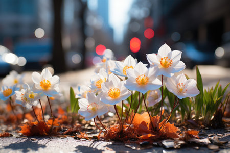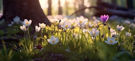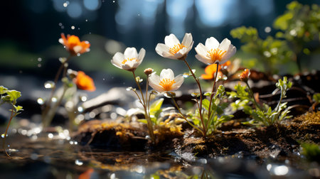 spring flowers and trees in the forest captured in a photorealistic representation using vray tracing. the image showcases the vibrant colors of the blooming flowers and lush greenery. water drops add a touch of freshness, while reflections enhance the natural beauty. evgeni gordiets skillfully creates a nature-inspired imagery with a mix of white and amber tones. ai generated