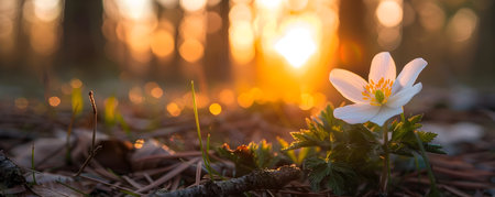 A close-up shot of delicate white flowers blooming in a forest, bathed in warm sunlight.
